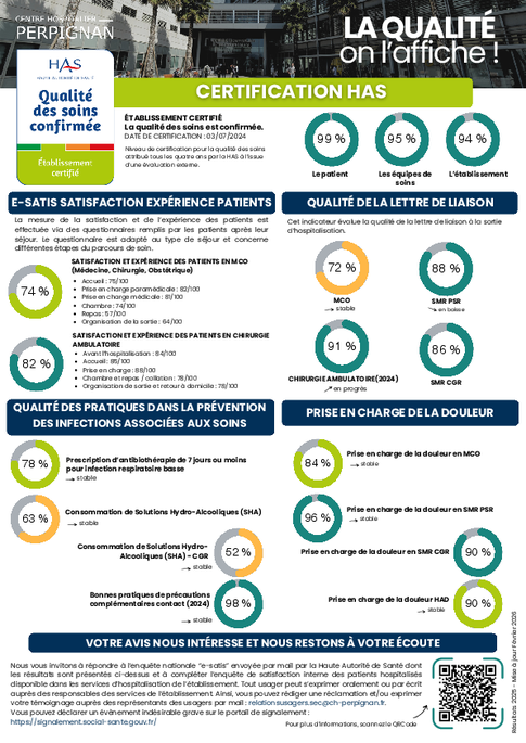 La dernière visite de certification V2024 (5ème itération), s’est déroulée en mars 2024. Le centre hospitalier de Perpignan a été certifié, avec les scores suivants :